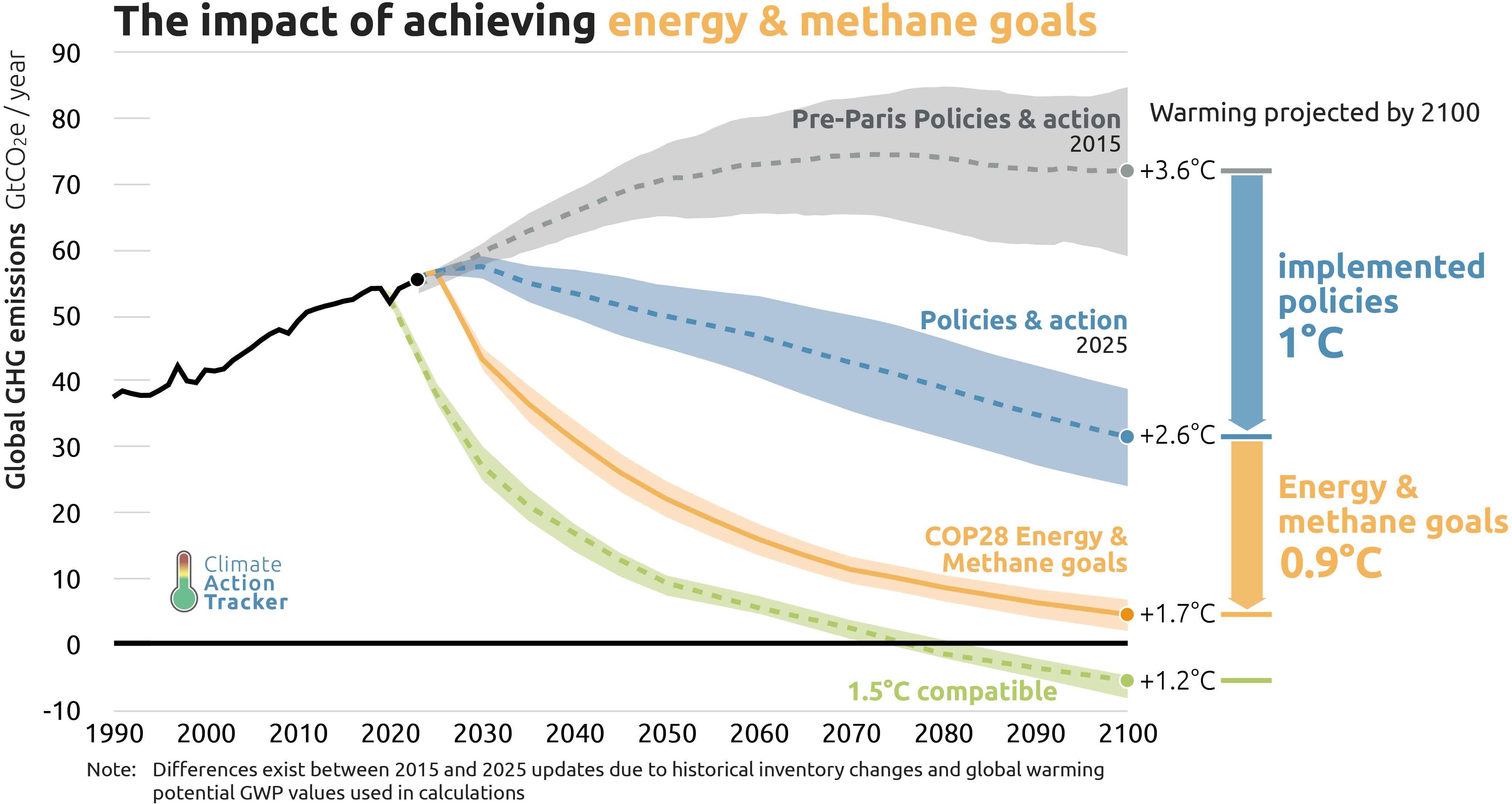 The analysis evaluates the global benefits of governments taking concerted action to deliver on the COP28 Energy and Methane Goals by 2030 and 2035, both in terms of emission trajectories and warming implications.