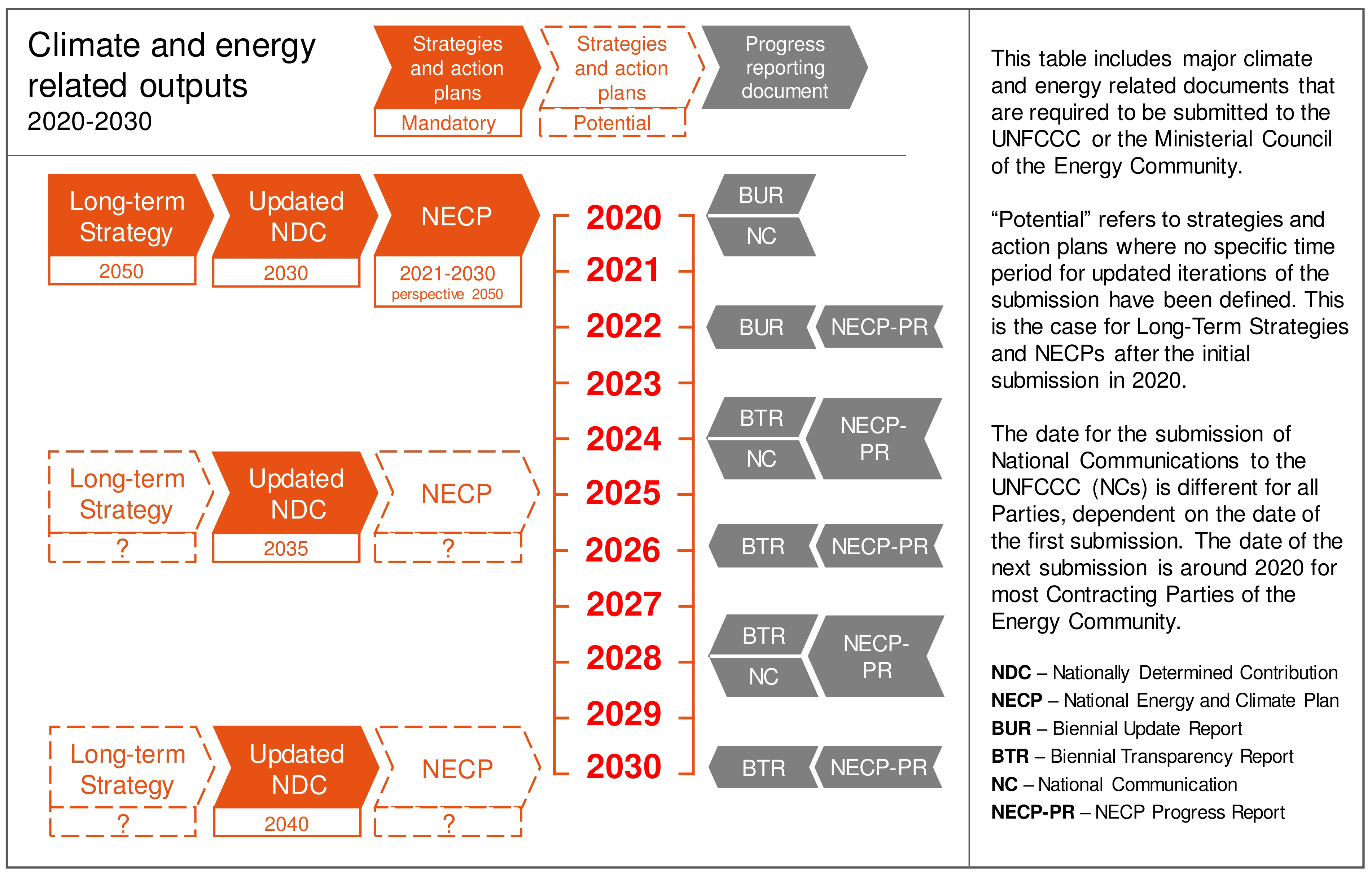 Contracting Parties of the Energy Community have recently committed to monitoring and reporting in the areas of renewables, energy efficiency, and greenhouse gas emissions by developing and adopting national energy and climate plans (NECPs) covering the period from 2021–2030. At the same time, countries have other energy and climate related planning processes running, sometimes to comply with international commitments and others for the purpose of formalising climate action at the national level; for example, they might also need to develop Nationally Determined Contributions (NDCs), Long-Term Strategies (LTS), National Energy Efficiency Action Plans (NEEAPs), National Renewable Action Plan (NREAP), and others.