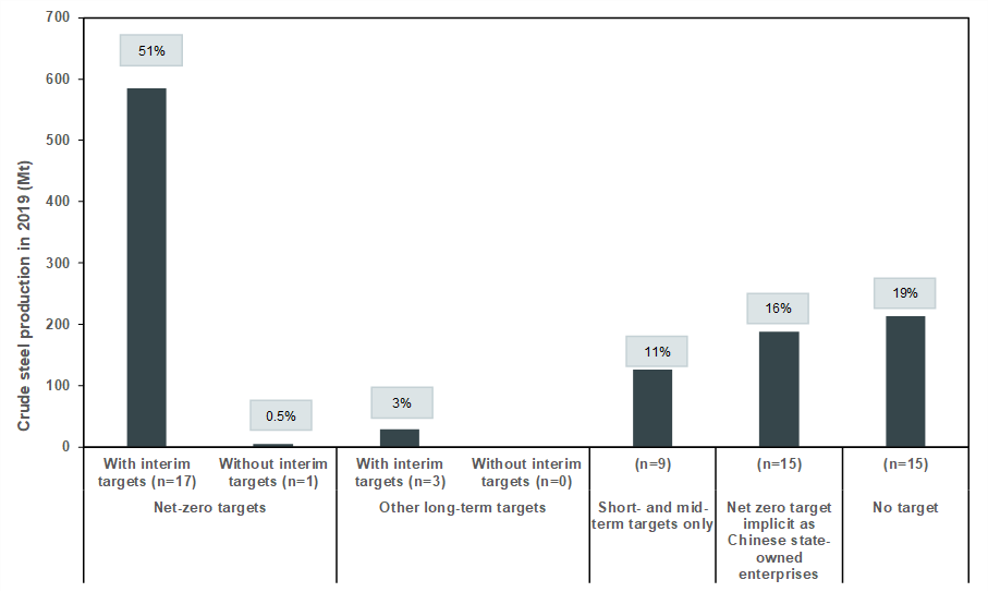 Fig. 1. Overview of GHG emission reduction targets set by the 60 largest steel companies. The percentage figures represent the shares in the total crude steel production of the 60 largest companies in 2019.