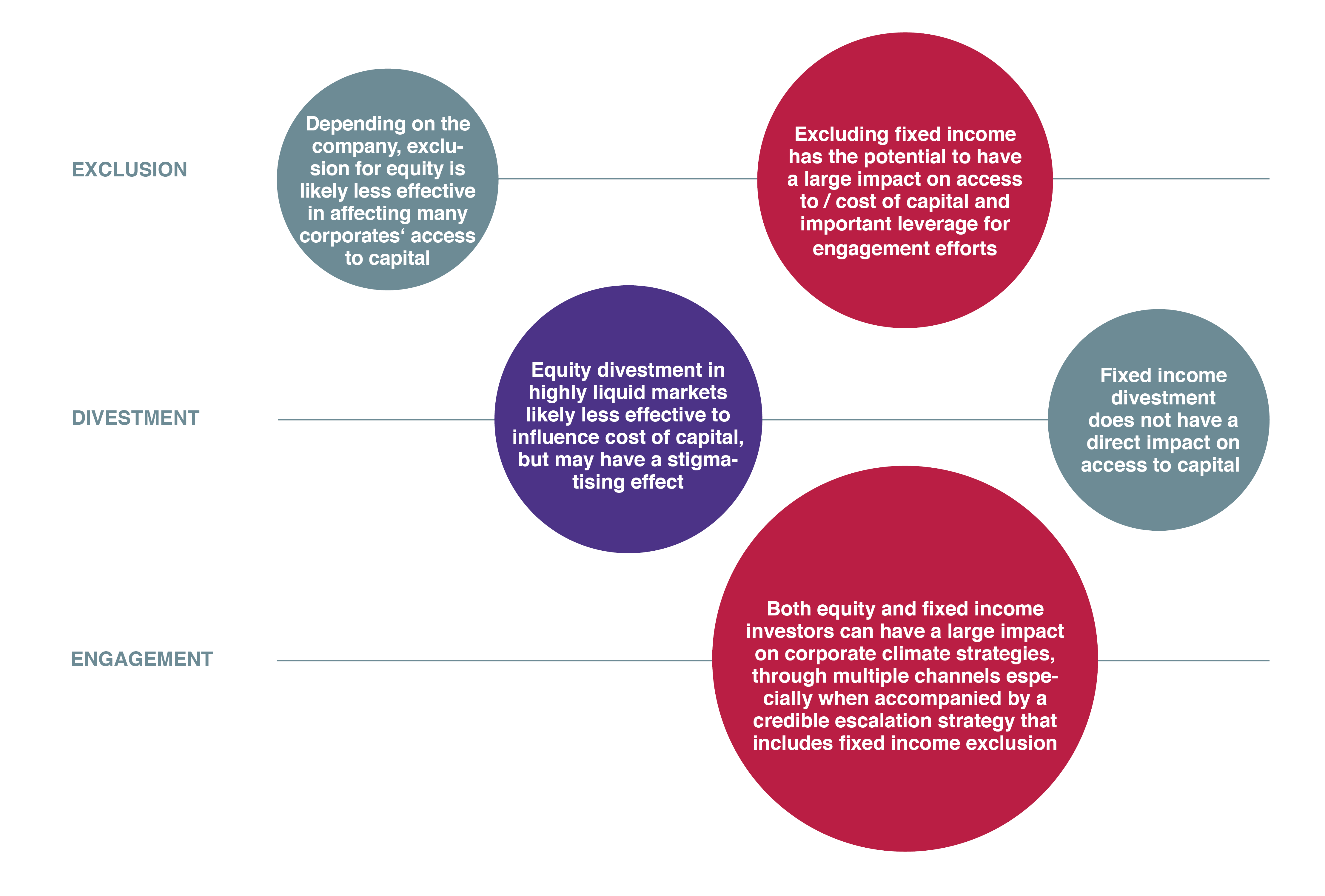 Asset owners and managers have three main channels to influence emissions in the real economy: exclusion, divestment, and engagement (see Figure 1). Interrelated and potentially mutually reinforcing, their potential to support increased climate action in both debt and equity markets are underutilised. In order to make financial flows consistent with the Paris Agreement, asset owners and managers need to take much more advantage of the leverage they have (see Figure 2).
