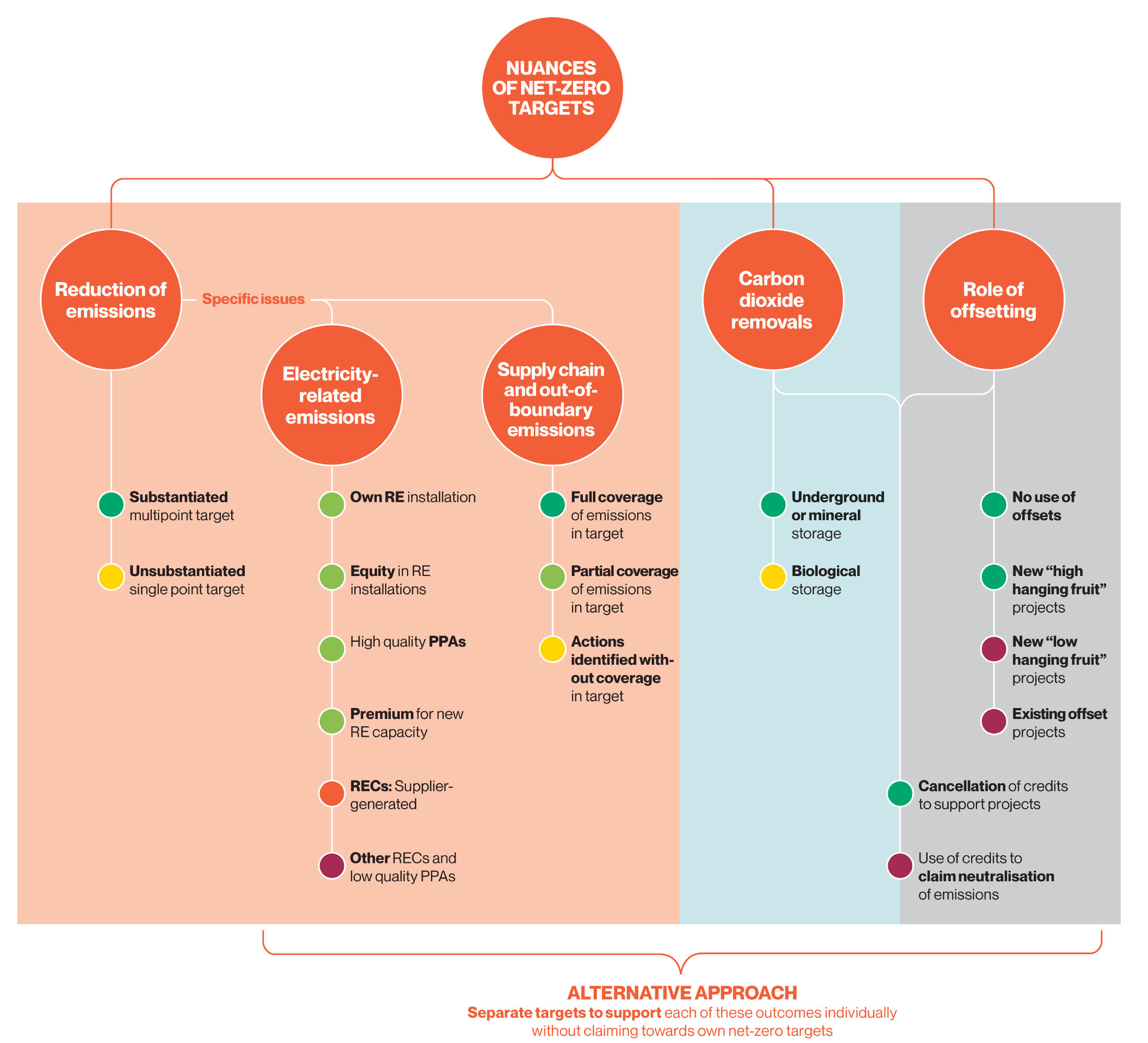 Figure 2. Overview of the key nuances of net-zero target implementation approaches.